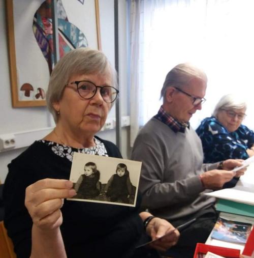 Ensimmäisen Elämänkaarikerhon jäsenet Raili Turunen ja Kari U. Pesonen pöydän ääressä. Takarivissä Pekka Sarkkinen, Liisa Hirvonen ja Onni Hartikainen.